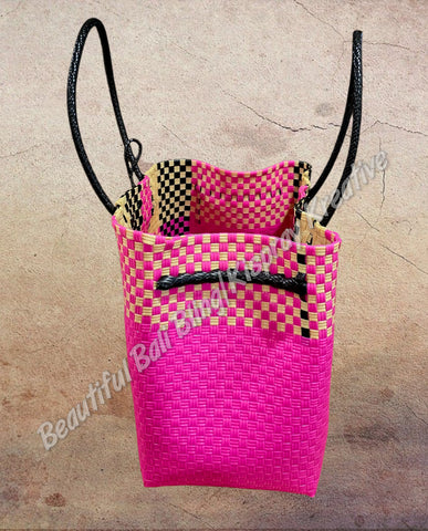 Handmade from recycled plastics, mainly bottles.